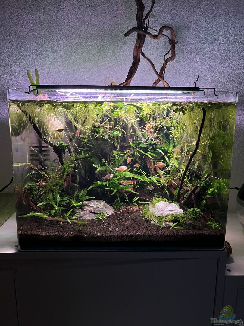 Weissglas-Becken von Dennerle (Nano Tank 70l) wird ohne GlasAbdeckung betrieben, das Holz-Hardscape (Wurzel) von Amtra Dragon Skin steht oben einige cm heraus. Als Schattenspender dient eine Schwimmpflanzendecke Schwarze selbstklebende Rückwandfolie Die Einrichtung selbst wurde nicht mit Fotos begleitet, da mein erstes Becken