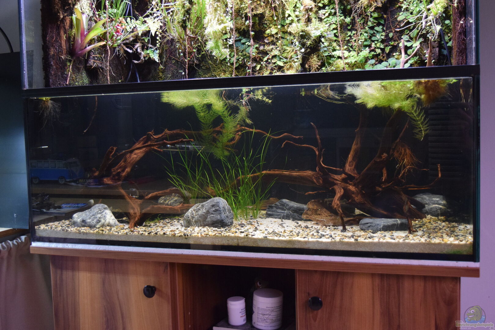 Sonderanfertigung von Aquarien und Terrarienbau Jebramek in Nürnberg. Der Wasserstand beträgt 35 cm. Ein mit Kabelbindern zusammen gebundenes Aluminium-Gestell befindet sich in der Abdeckung und fungiert als Decke, um darin Wurzeln anzubinden, die ebenso mit Kabelbindern zusammengehalten werden. Weiterhin hängen von der Decke künstlich erstellte Lianen. Sie wurden aus Paketschnur, Aquariensilion und einer Mischung aus gehäckselten Xaxim- und Weisstorf-Resten erstellt. Um das Ganze noch natürlicher [...]