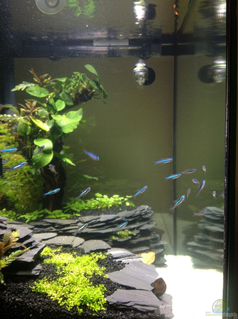Dies ist der aktuelle Besatz Stand 1.12.2013 5 Orangetrack Rennschnecke 5 Ohrgitterharnischwelse Otocinclus hoppei 8 Amanogarnelen Caridina multidentata 5 Red-Fire Sakura-Garnelen ca. 30 Grüne Algengarnelen 48 Blauer Neon Paracheirodon simulans der ruhige aber neugierige Salmler Paracheirodon simultan ist kein Fisch für ein Wartezimmerbecken, da er sehr auf Spiegelungen und Bewegungen au??erhalb des Beckens reagiert. Auch die Vergesellschaftung mit unruhigen Fischen halte ich für [...]
