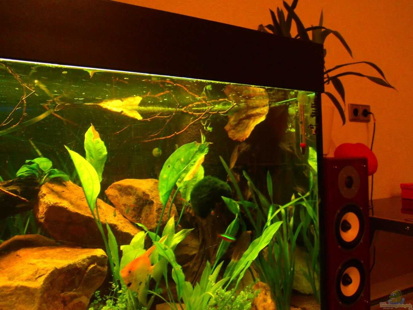 Aquariumschrank ist ein Eigenbau aus Arbeitsplatten in Nussbaumoptik. Die Rückwand ist einfach ein zugeschnittener Karton, den ich schwarz angestrichen habe. Das macht einen tiefern eindruck und der Hamburger Mattenfilter fällt auch nicht mehr so auf. Entschuldigt die teilweise schlechte Bildqualität. Viele Bilder wurden mit der Handykamera aufgenommen.