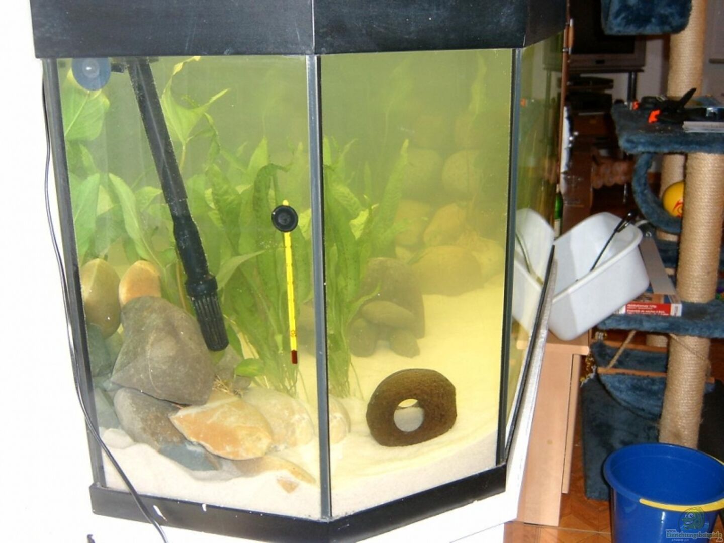 Es ist eine veraltete Juwelausführung der Sorte ´Panaorama´. Der Schrank ist marke Eigenbau, genau wie die Abdeckung. Katzentraum, weil das Aquarium den Platz des Kratzbaumes ersetzt in Hinsicht auf den Ausblick zum Vogelhaus.