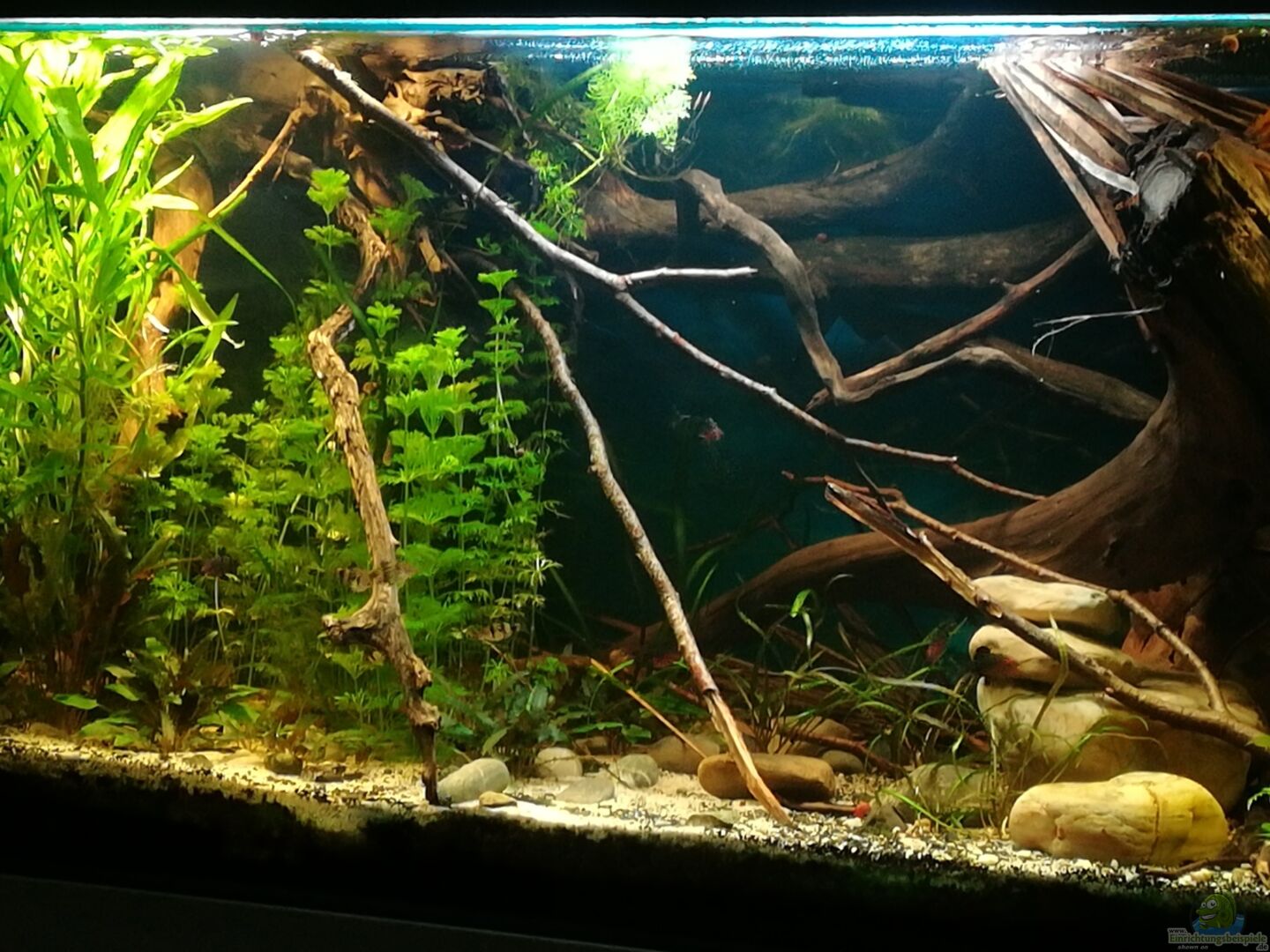 3 gro??e imposante echte Moorkienwurzeln. Ich habe hierbei darauf geachtet, ein Exemplar ohne krasse Absäge Schnitte zu bekommen, sondern eher mit abgebrochenen Teilen, damit diese so natürlich wie nur möglich aussieht. 1 Apfelbaumast ohne Rinde sowie ein paar Buchenzweige mit Rinde. Dieses Material wird dann immer wieder mal getauscht und es wird mit anderen Materialien experimentiert. Weiterhin momentan Buchenblätter sowie mehrere Kiesel verschiedener Grö??e und ein paar grö??ere Steine. 1 [...]