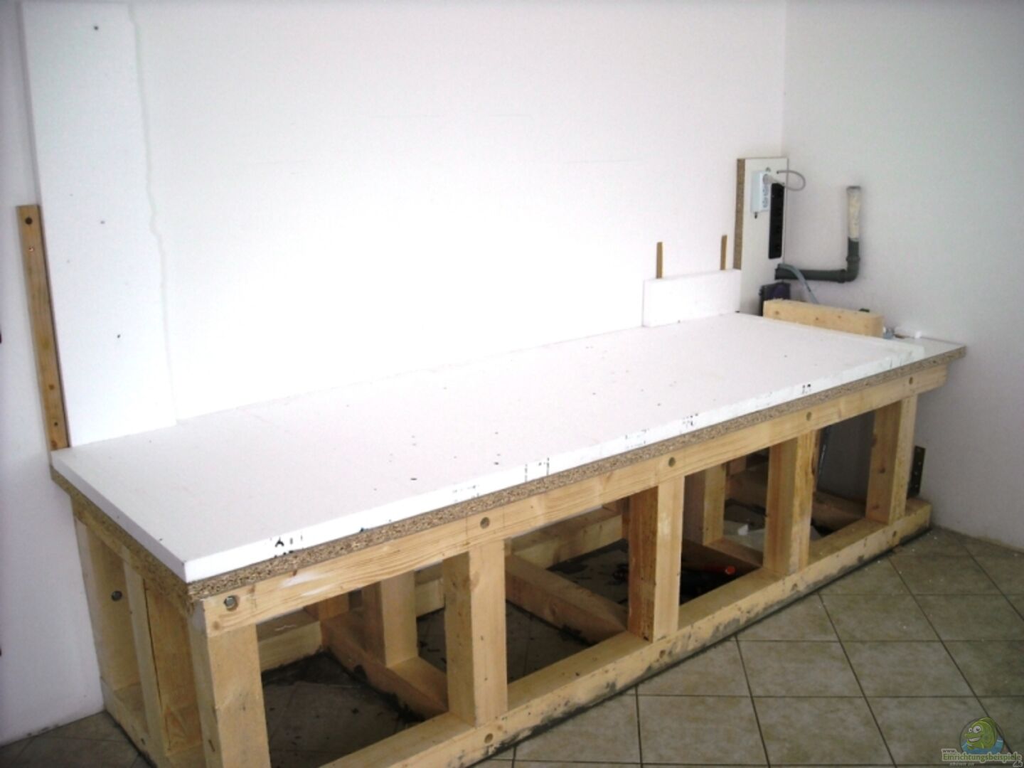 Das Aquarium wurde aus 12mm Floatglas gefertigt, auf Sto?? verklebt und mit einer Sicherheitsnaht versehen. Es verfügt über einen Mittelsteg, Längsstreben unten und oben und einer eingauten Filterkammer mit 4 Kammern. ***** Das Becken kommt von Megazoo. ***** Der Unterbau wurde aus 10x10cm Staffeln vom Baumarkt gefertigt und in eine Estrichausgleichsmasse gelegt um eine idelae Verbindung zu den vorhandenen Bodenfliesen zu ermöglichen. Weiters wurden die Staffeln mit 24 cm langen sechskant [...]