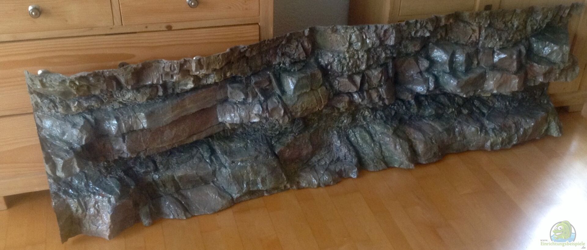 Rückwand Rockzolid, Timor, 198 x 58 cm, graubraun Div. Kunststein-Module (Rockzolid, Aqua Della), hohl/beschwimmbar Alpenkalk-Bruchsteine aus Iseltwald beim Brienzersee (CH) Hartholz-Hohlwurzeln Div. Schneckenhäuser (Neothauma tanganyicense, Angaria delphinus, Purpura panama, Rapana rapiformis, Helix pomatia).