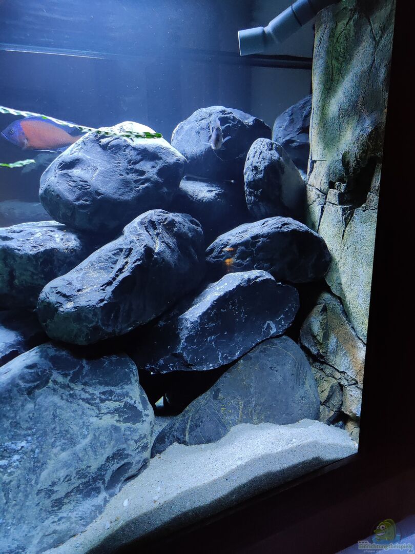 Als Deko und Versteckmöglichkeit ca. 1000kg Nero Ebano Fels von 20 bis 50cm Körnung die hauptsächlich auf der Wandseite zu einem gro??en Steinhaufen zusammen gepuzzelt wurden. 2 Stück Talawa Wurzeln im XXL Format schmücken die andere Beckenhälfte und ragen vom Boden bis über die Wasserlinie. Diese Wurzeln wurden zuvor mehr als 3 Monate gewässert, so dass Sie letztlich keine Gerbstoffe mehr abgaben. Nach all den Jahren mit nur kargem Fels im Wohnzimmer, hat dieser Teil des Malawisee nun auch [...]