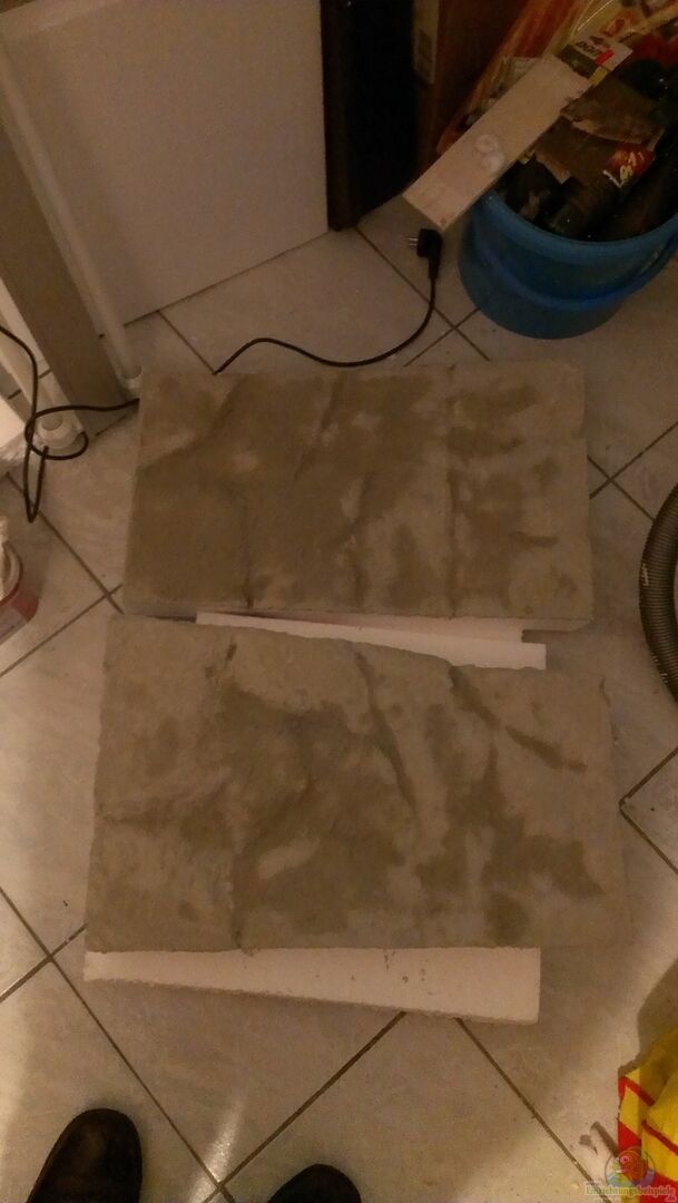 Selbstgebastelte 3D Rückwand aus Styropor und Fliesenkleber. Diese Rückwand hab ich nach dem Wassereinlauf wieder rausreisen müssen, die Farbe löste sich vom Fliesenkleber. Nach gründlicher Ursachenforschung kann es dafür nur eine Erklärung geben: die Restfeuchte des Flie??enklebers. Wenn man bedenkt, das Beton am Tag 1mm trocknet (hat mir ein Fachmann gesagt, bei idealen Bedingungen) hätte ich ja bei schlechten Bedingungen mindestens 14 Tage trocknen lassen müssen. Naja, wie schon einige [...]
