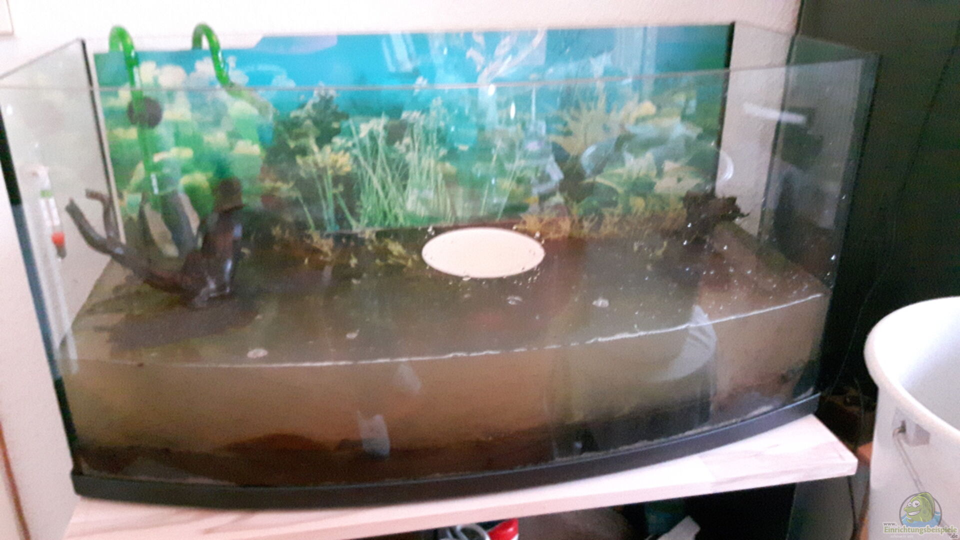 Das Becken hat eine gewölbte Frontscheibe, daher an den Seiten 30 cm, in der Mitte 38 cm tief. Der grö??te Teil des Wassers wurde aus dem alten 96 l Becken übernommen, genauso der bereits seit längerem laufende Au??enfilter sowie die Pflanzen.