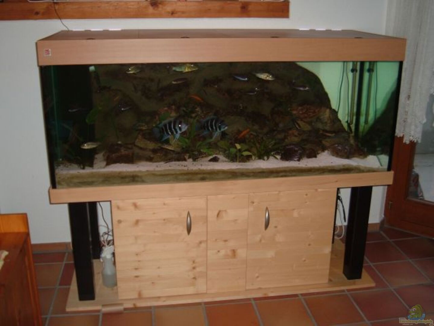 Das Becken steht auf einem Möbel Marke Eigenbau. Das Gewicht wird auf Holzträger im Innern sowie auf die 4 Stahlsäulen verteilt. Die Schränke bieten Platz für Alles, was zu einem AQ halt so benötigt wird. Zusätzlich habe ich noch eine separate Wand angefertigt, die ich bei Sonneneinstrahlung ( besonders im Winter) einfach an der Seite anbringen kann.