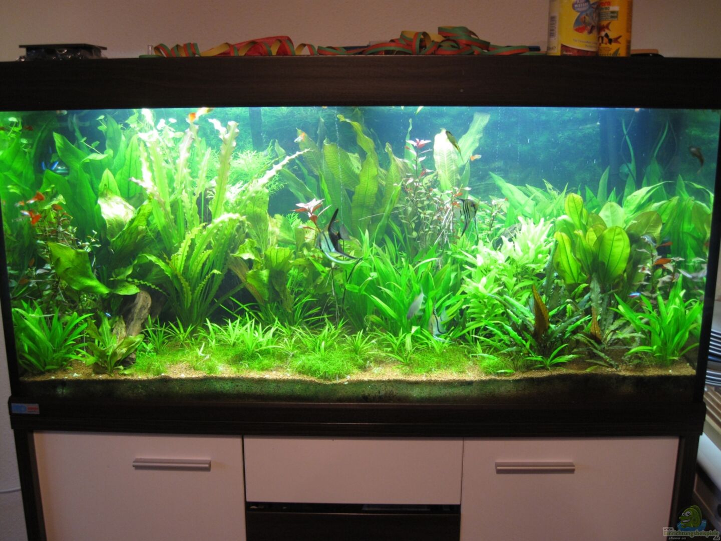 Dieses Becken soll möglichst optimal auf die Blaupunktbuntbarsche abgestimmt sein. Glücklicherweise lassen Blaupunktbuntbarsche die Pflanzen komplett in Ruhe und wühlen nicht. Ich könnte also jede beliebige Pflanzenart halten. Damit das Aqurium aber noch natürlich wirkt, habe ich mich auf 5 verschiedene Pflanzenarten beschränkt.