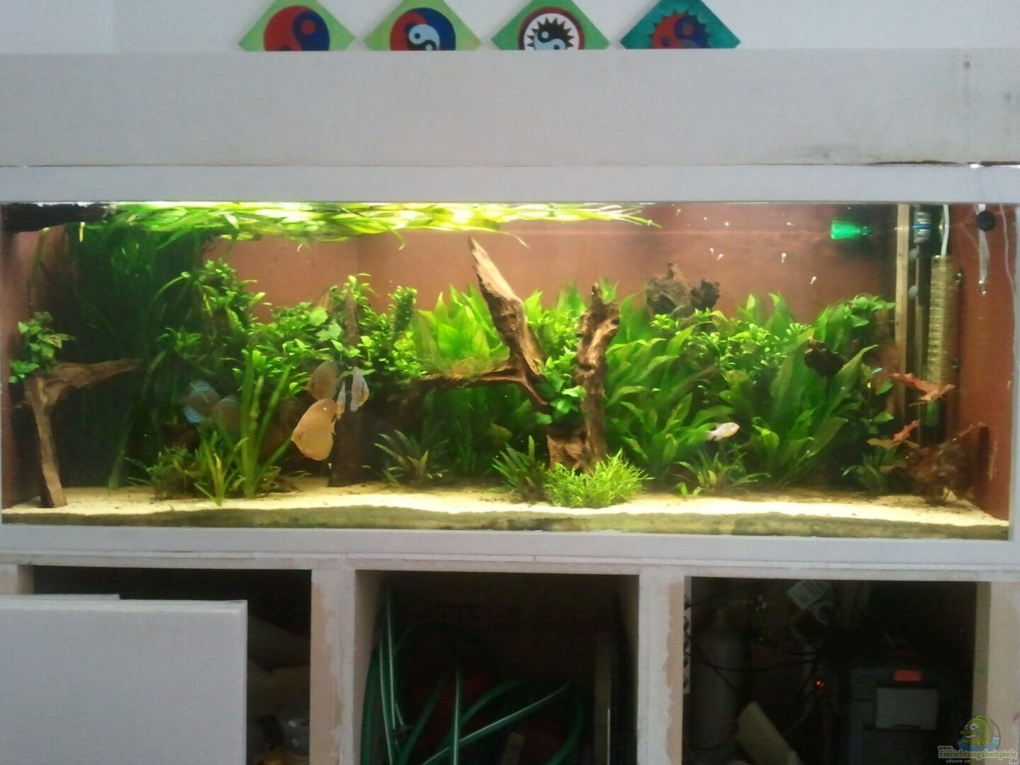 Holzaquarium Marke Eigenbau. Becken, Beleuchtung sowie Unterschrank sind selbstgebaut. Besonderheit ist neben dem Werkstoff der innen liegende Kabelkanal. Seitliches Profil ist ein Trapez, Rück- und Seitenwände sind bewusst höher als die Front, Ziel war Spritzschutz und Anbringung der Abdeckung.