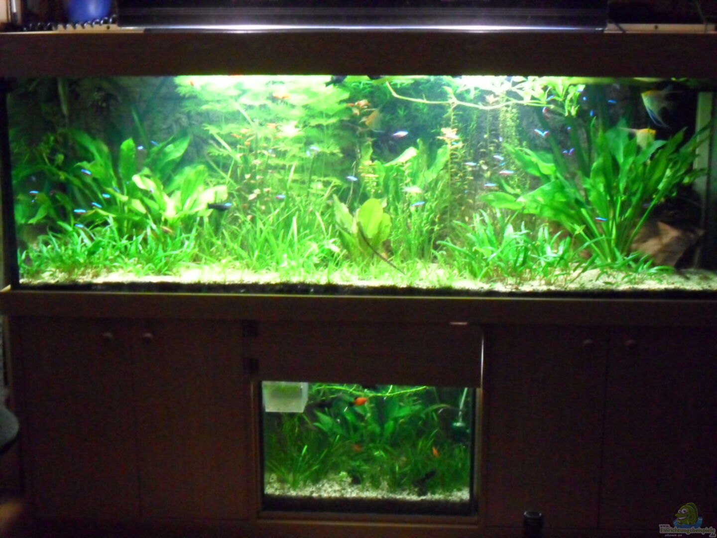 Ich fand über einen aquarienfreund jemanden, der ein gebrauchte Becken kombi loswerden wollte, zwar mit T8 leuchte aber mit unterschrank becken wo die fische meiner freundin auch platz haben. MIt gro??en Eheim 2228 und fu??bodenheizung dazu sowie anderen diversen kleinteilen.----Hochschleppen mussten es wir trotzdem selber---- Kleines unterbecken im schrank ca. 110 liter. Beide Becken sind abgedeckt mit 4mm Glasscheiben.