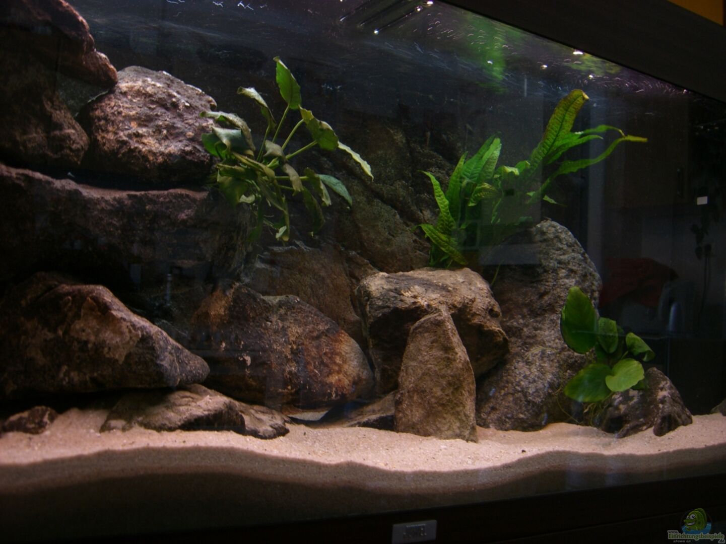 ca. 70 kg Granitbruch, aus einem begradigten Flu??teil 5mm Felxiglas als Bodenschutz eingesetzt und darauf die Steine als Fundament platziert. So können die Malawis buddeln, ohne dass mein Steinaufbau Gefahr läuft zusammenzubrechen. 3D Rückwand