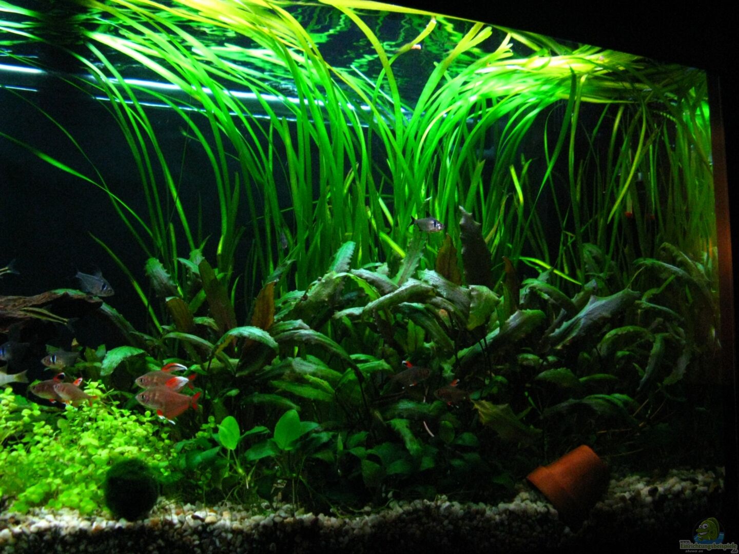 Ziel ist es, in der rechten Beckenhälfte einen dichten Wasserpflanzendschungel zu bilden, welcher auch den Filterkasten verdeckt. Die Vielfalt der Pflanzen wird in den nächsten Monaten nach und nach erhöht. Die linke Seite wird von der Mangrovenwurzel und einer grossen Solitärpflanze (Echinodorus bleheri) dominiert. Links vorne wird das Becken mittels Schwimmpflanzen abgedunkelt. Hintergrund: - Vallisneria americana, wuchert enorm, Ausdünnung jede Woche notwendig - Echinodorus bleheri, [...]