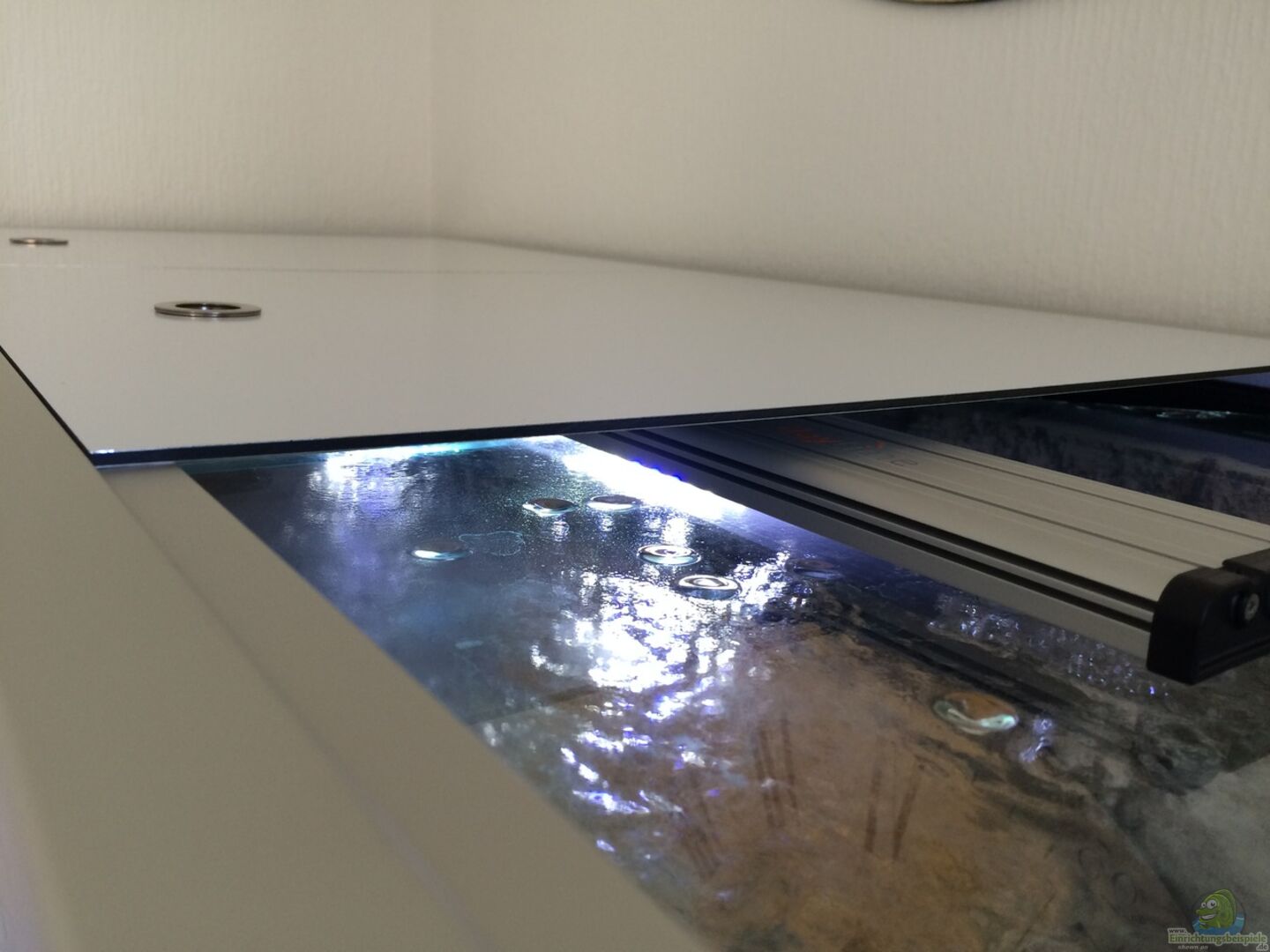 Becken aus 10mm Floatglas von JEKO-Aquaristik. Das Becken ist dreiseitig mit opaker Folie in schwarz matt beklebt. Rechte Seitenscheibe teilweise Kontur ausgeschnitten. Abgedeckt mit 4 Stück 4mm Scheiben. Jeweils rechts & links vom Mittelsteg 2 Stück die in schwarzen E-Profilen geführt werden. Diese liegen auf den längs verklebten Stegen. Somit kann ich die Abdeckscheiben relativ einfach bewegen - quasi Schiebetüren als Abdeckung. Unterbau besteht aus 45mm Alu-Profilen von Aluprofiltechnik [...]