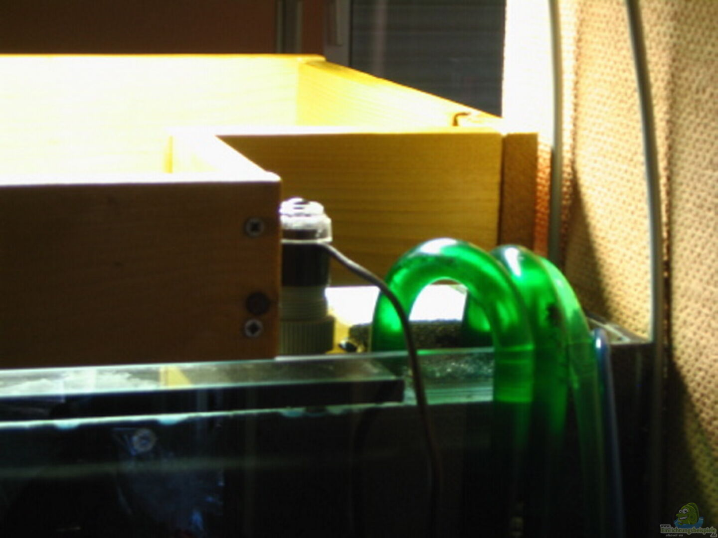Heizstab 200 Watt Ausströmer jede Std. für 10 Min. zugeschaltet Fichtenholzabdeckung mit schwarzen Fliegengitter gegen ein herausspringen der Fische abgesichert. (Wollte keine mit der Zeit unansehnlich werdende Glasabdeckung einsetzen und bin bisher positiv von der Wirksamkeit und Pflegefreundlichkeit der Abdeckung überrascht).