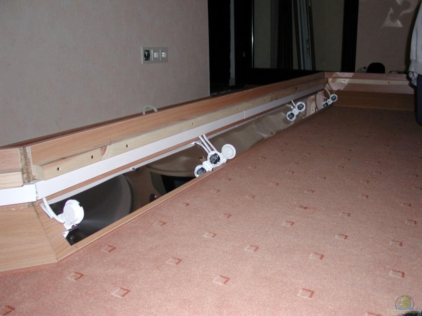 1x Tunze Stream (4.000 - 7.000 l/h) als Strömungspumpe im Stein ganz links vorne 2x 300 W Jäger Heizstab im Filteraquarium seit Sept. 2005 Anschlu?? an unsere Hausheizung automatischer Wasserwechsel am Filter (Zulauf bei den Pumpen und ??berlauf vor den Matten)