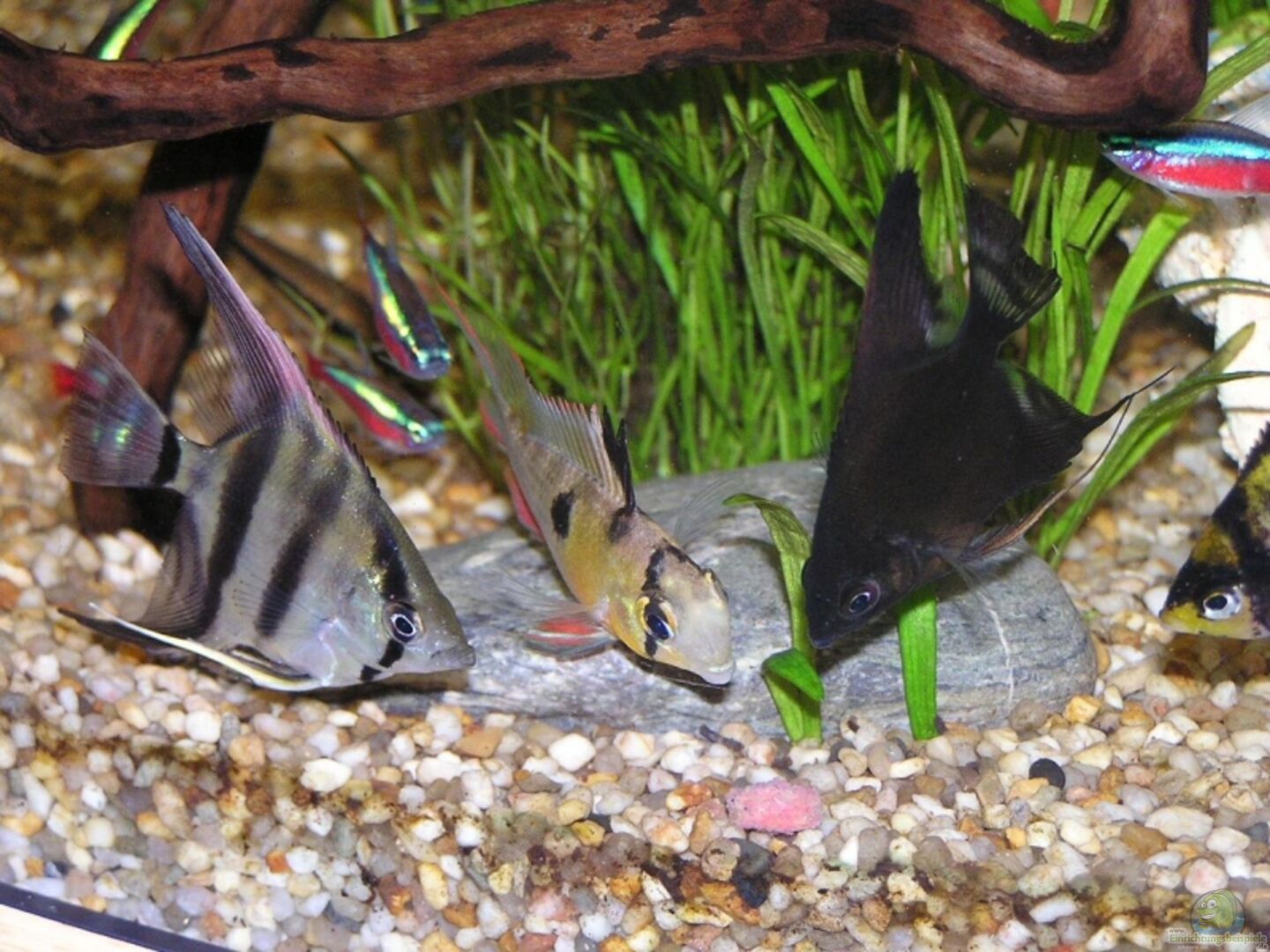 2 x Ancistrus sp. albino (gelber Antennenwels) 2 x Ancistrus dolichopterus (blauer Antennenwels) 4 x Trichogaster chuna (Honiggurami) 22 x Paracheirodon axelrodi (roter Neon) 3 x Pterophyllum scalare (Skalare) 2 x Mikrogeophagus altispinosus (Schmetterlingsbuntbarsch) 3 x Crossocheilus siamensis (siamesische Rüsselbarbe) 4 x Amano Garnele 1x Apfelschnecke