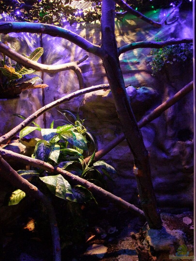 Im Auarium sind ein paar Wurzeln und ein paar Steine Die Rückwand geht nahtlos als Ufer in den Boden des Landteils über Die Einrichtung im Landteil besteht überwiegend aus Apfelbaum und Kirschbaum ??sten aus dem Garten sowie ein paar Steinen die als Zone ohne Bodengrund dienen. Eine Eiablagestelle für Lucy gibt es im hinteren Bereich (Dicker Bodengrund, versteckt hinter der Kunstpflanze, warm und viel Regen - also feucht)