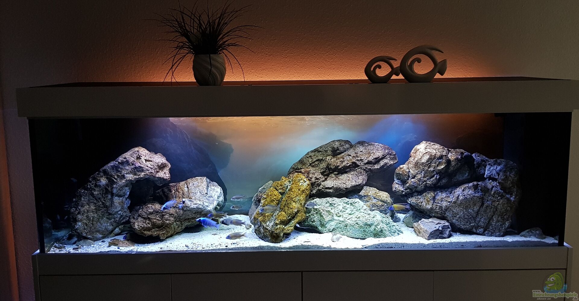 Diese Aquarium Kombi ist von der Firma Aquarium Wilhelmi, Dortmund. Unterschrank und Abdeckung in wei?? hochglanz. Das Becken besteht aus 12 mm Floatglas, sto??verklebt. Die Rückseite ist mit einer auf 4 mm Plexiglas aufgebrachten Fototapete bestückt. Durch diesen Hintergrund entsteht eine schöne Tiefenwirkung.