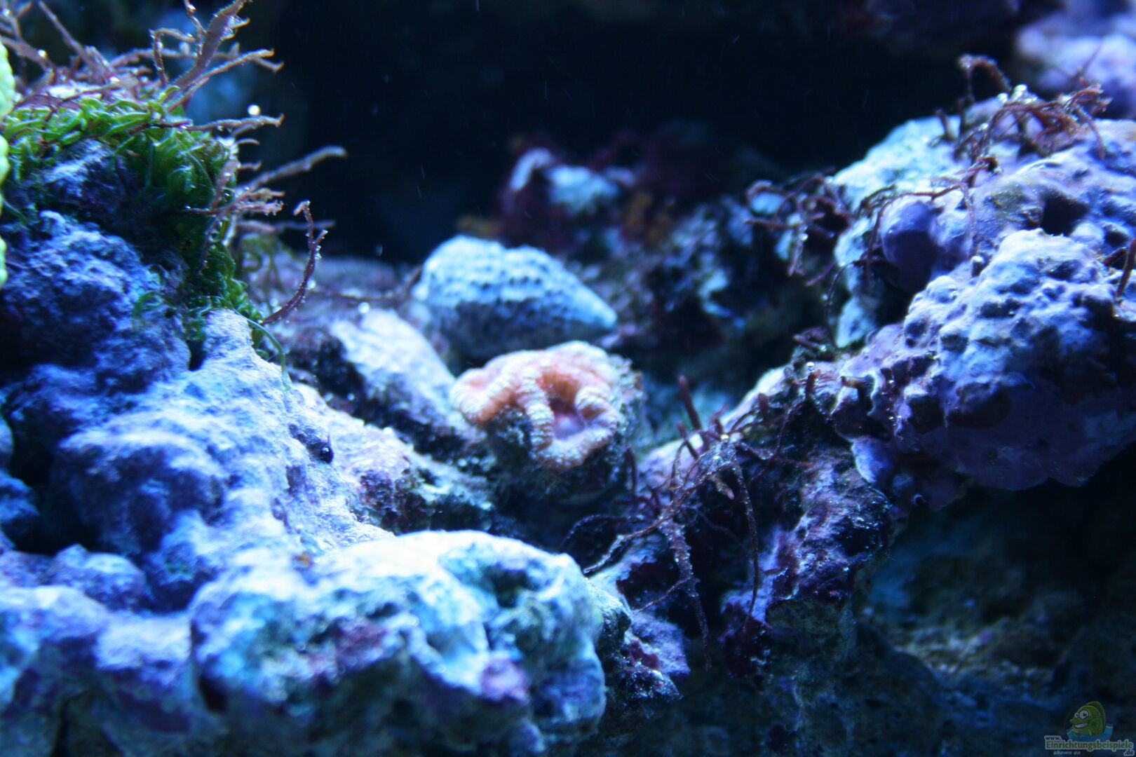 2 x Amphiprion ocellaris - Falscher Clown - Anemonenfisch 1 Synchiropus stellatus - Sternen-Mandarinfisch 3 x Calcinus laevimanus - Großscheren-Einsiedlerkrebs verschiedene Scheiben- und Krustenanemonen 1 x Entacmaea quadricolor - Blasenanemone verschiedene Acropora Caulastrea furcata Acanthastrea Montipora "Superman" Capnella imbricata ??? Keniabäumchen grün und lila Gorgonien Chalice Sinularia brassica grün