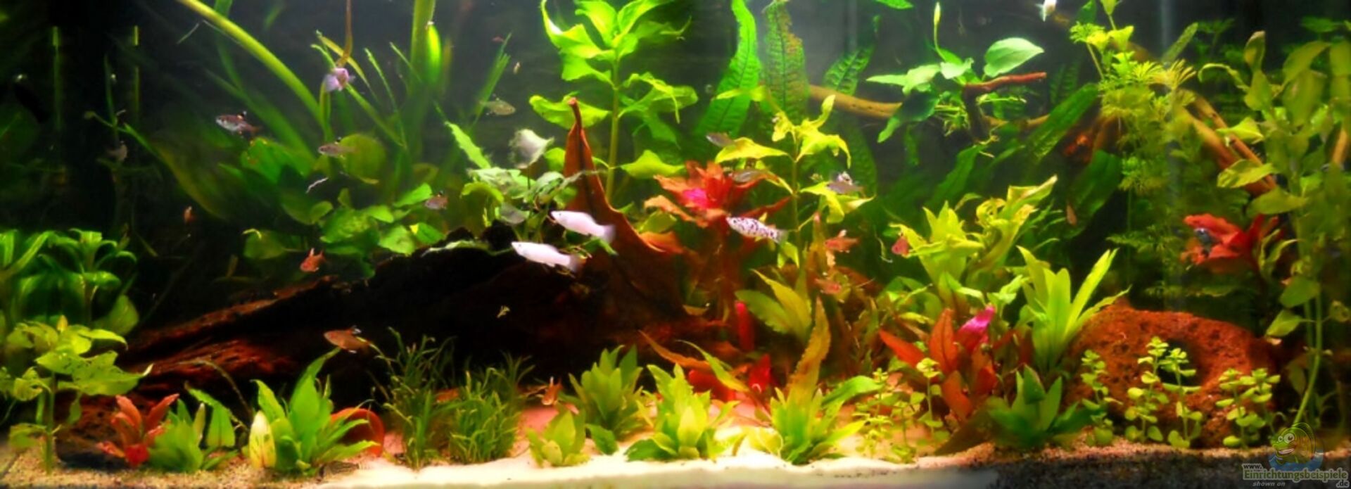 Juwel Rio 180, der Innenfilter wurde entfernt um das komplette Beckenvolumen ausnutzen zu können. Im Mittelbereich eine abgetrennte Sandbank für die Panzerwelse.