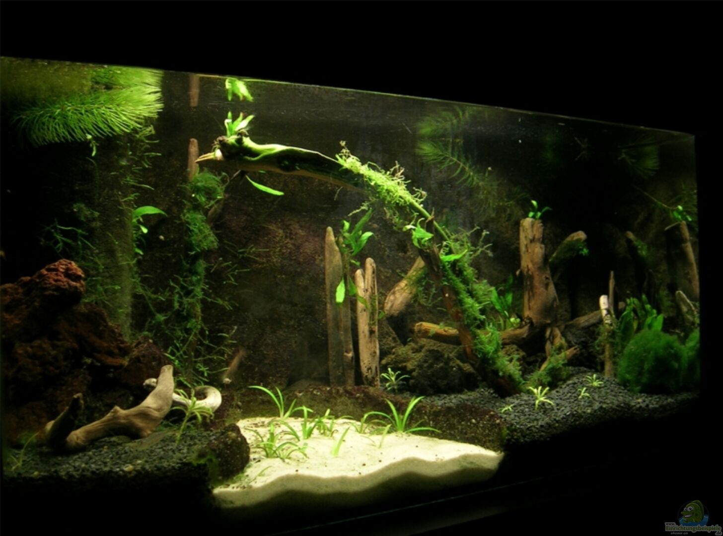 Standart Juwel Becken läuft seit Juni 07. Die Rückwand und die Terassen sind selbstgebaut (nach Internetanleitungen). Die beiden Terassen sind so angeordnet, dass sich eine Art nach hinten verjüngende Bucht ergibt. Durch die ??ffnung nach vorne ergibt sich, dass sich der komplette Sandbereich in einem Winkel von bis zu 90° betrachten lässt. (Herstellung siehe Blog)