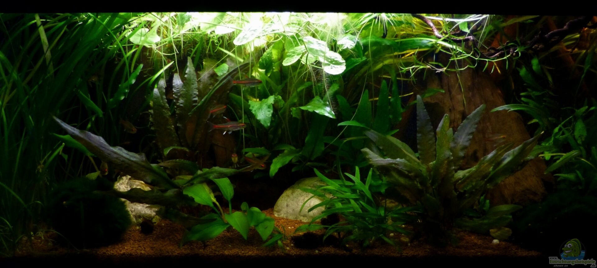 - Glasstärke 4 mm Floatglas - Mit schwarzem Silikon sto??verklebt - Ohne Seitenstreben - selbst gebauter HMF in der linken hinteren Ecke - Standartabdeckung durch Hagen Glomat1 Betriebseinheit für eine Leuchtstoffröhre bis 20 Watt aufgewertet, somit habe ich 2x 15Watt Beleuchtung die getrennt regelbar ist.
