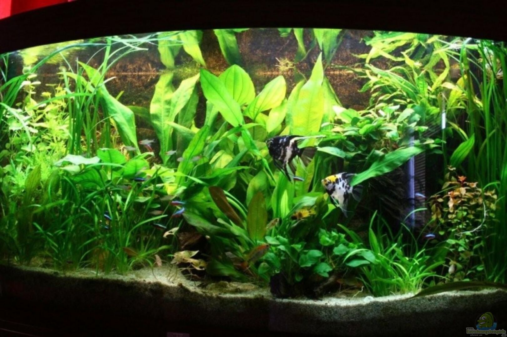 Das Becken ist ein Juwel Vision 260 mit gebogener Frontscheibe. Es läuft nun seit Ende August 2007. Anfangs wurde der Juwelinnenfilter eingesetzt, mittlerweile ist dieser durch einen Eheim 2078e ersetzt. Seit dem ist das Wasser kristallklar, vorher hatte ich immer Schwebepartikel. Zudem läuft eine Mondlicht LED von eBay von 22h bis 1h, was den Fischen während des Fernsehens im Wohnzimmer wohl gut tut, weil sie sich oft auch bei Dunkelheit im Mondlicht aufhalten.