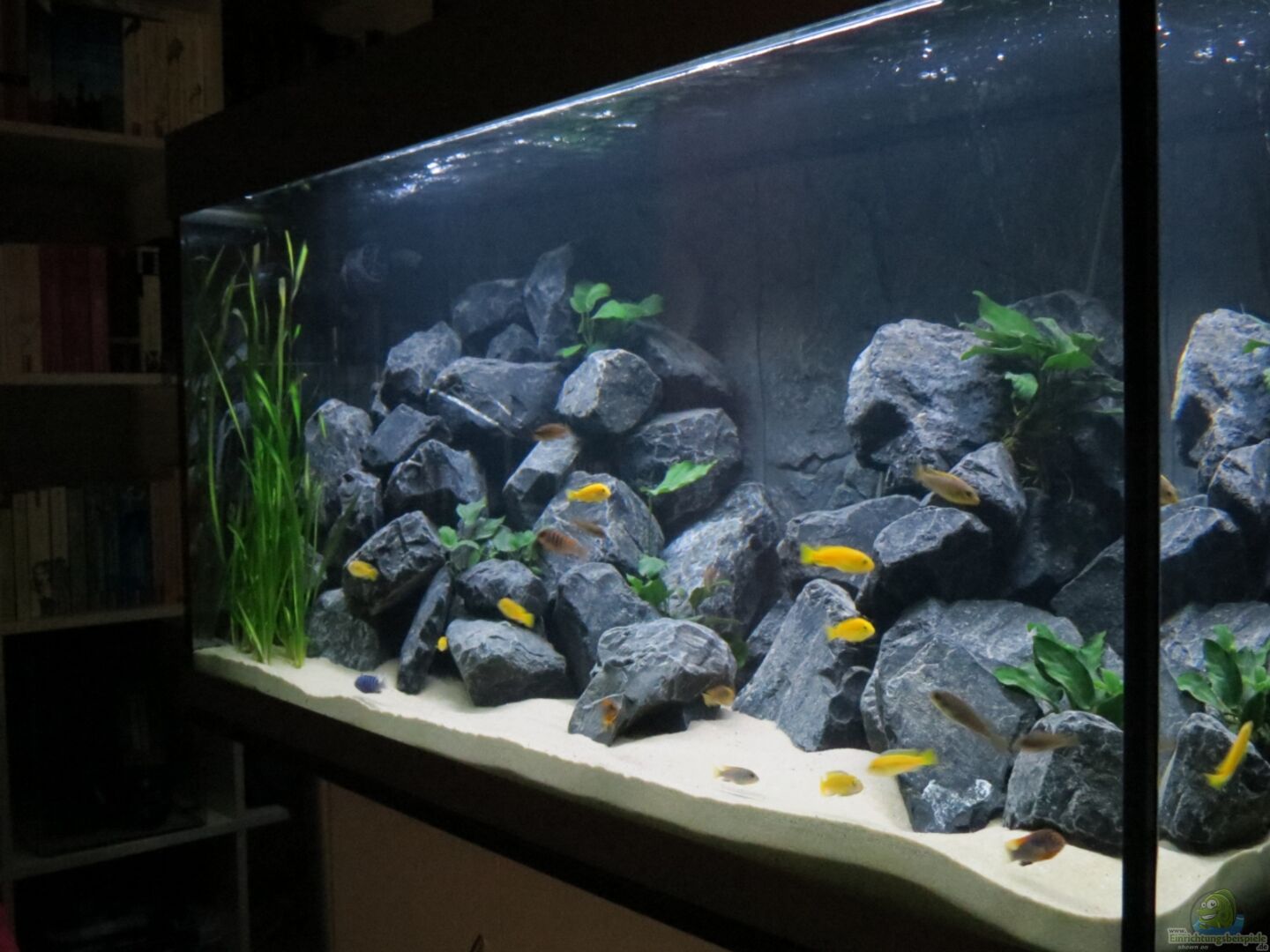 Dies ist mein erstes Malawibecken und auch das erste in dieser Grö??enordnung. Die Kombination wurde auf Wunsch von der Firma Friedeberg gefertigt. Die Scheiben sind doppelt Stossverklebt. Aufgrund des hohen Steinaufbaus auf der linken Beckenseite, habe ich die linke Seitenscheibe zusätzlich zur Styrodurplatte auf der Bodenscheibe, mit einer 2mm Plexiglasscheibe gesichert, um Unfällen durch Umfallende Steine vorzubeugen.