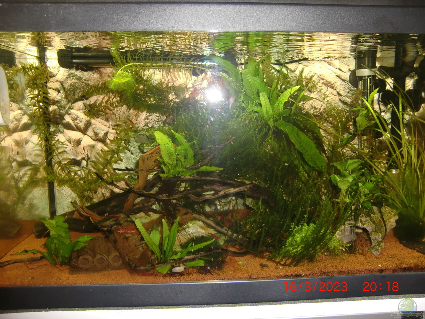 Standardbecken, stand im Keller, gereinigt und neu aktiviert steht in meinem Büro/Männerzimmer im Keller auf einem Alu-Gestell eines 1 Meter Beckens, dieses habe ich verkauft auf Grund der gestiegenen Energiepreise und da ich keine Abnehmer für meine ständigen Sajicas hatte Für da Becken habe ich nur Deko, Pflanzen und Besatz gekauft, Hardware sind Restbestände aus dem Keller Rückwandfolie in Steinoptik
