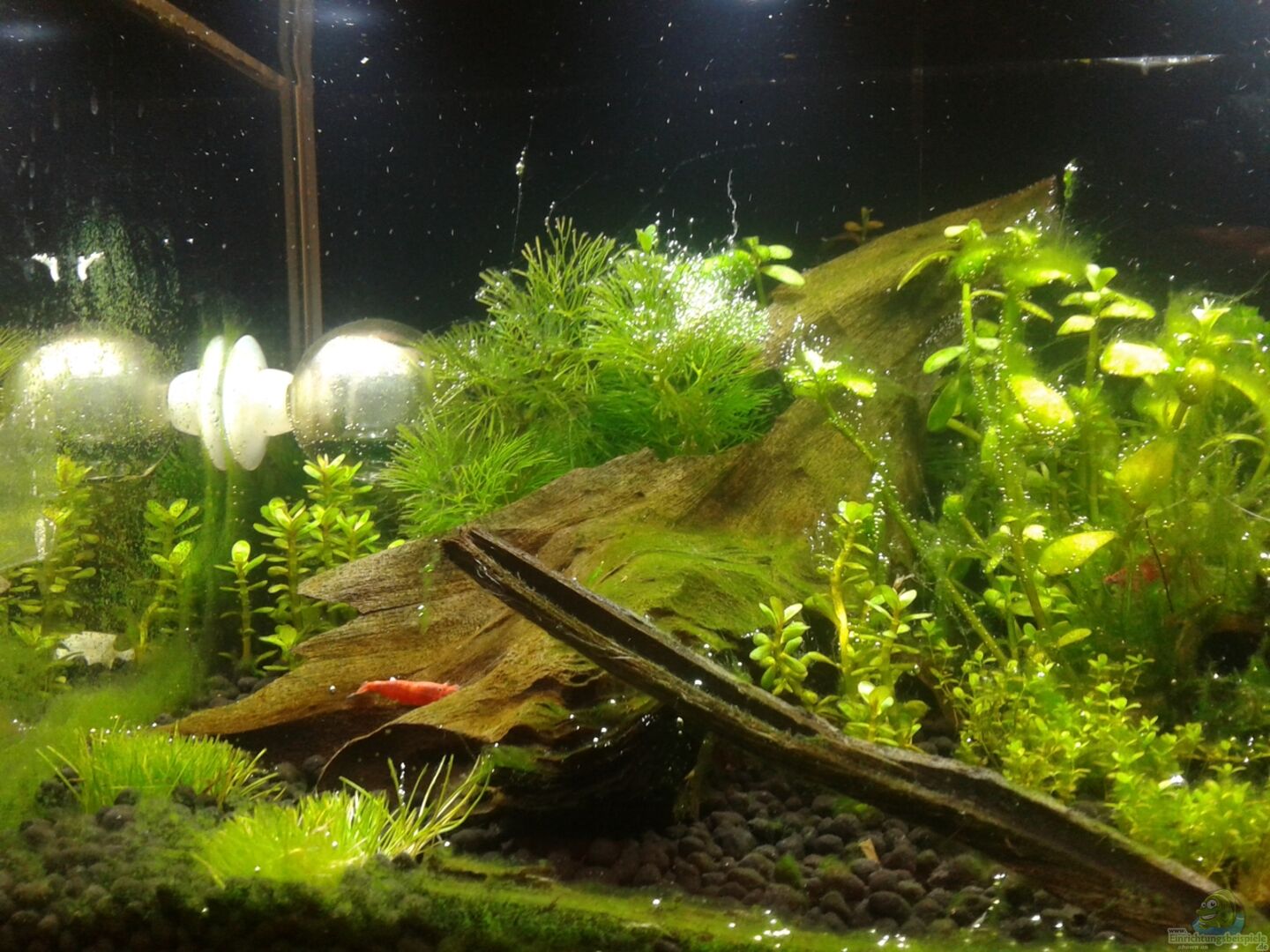 Selektionsbecken für 2 Zuchtbecken selber Grö??e. Alle sind ein wenig im Aquascaping-Stil angelegt und sind durch den starken Pflanzenwuchs passend für die Bedürfnisse der Garnelen eingerichtet. Rückscheibe ist für mehr Tiefenwirkung mit schwarzer Folie beklebt.