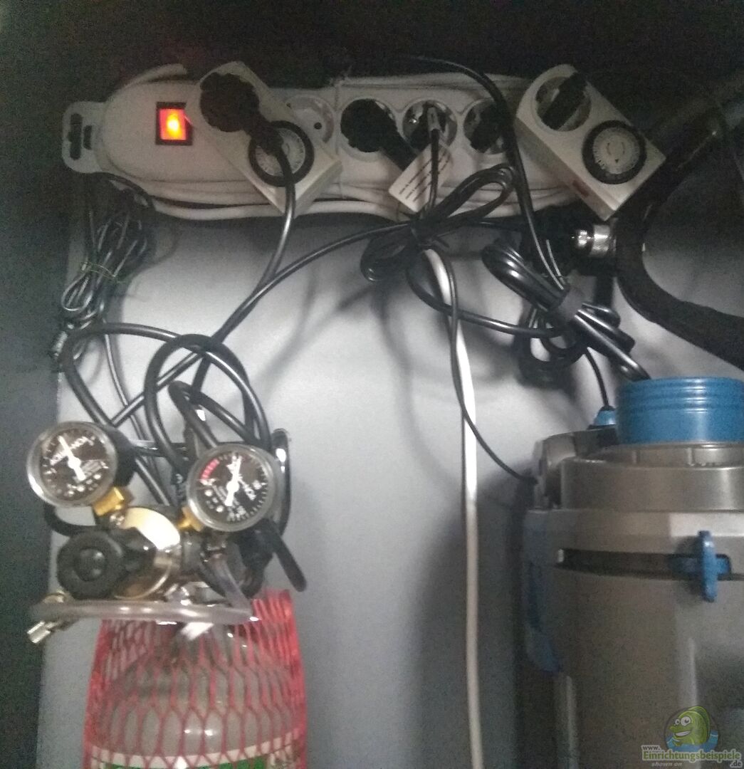 2Kg Co2 Anlage mit Inlinediffusor, Nachtabschaltung und Druckminderer. Die Anlage schaltet sich über eine Zeitschaltuhr eine Stunde vor dem Licht ein und eine Stunde bevor das Licht ausgeht wieder aus.