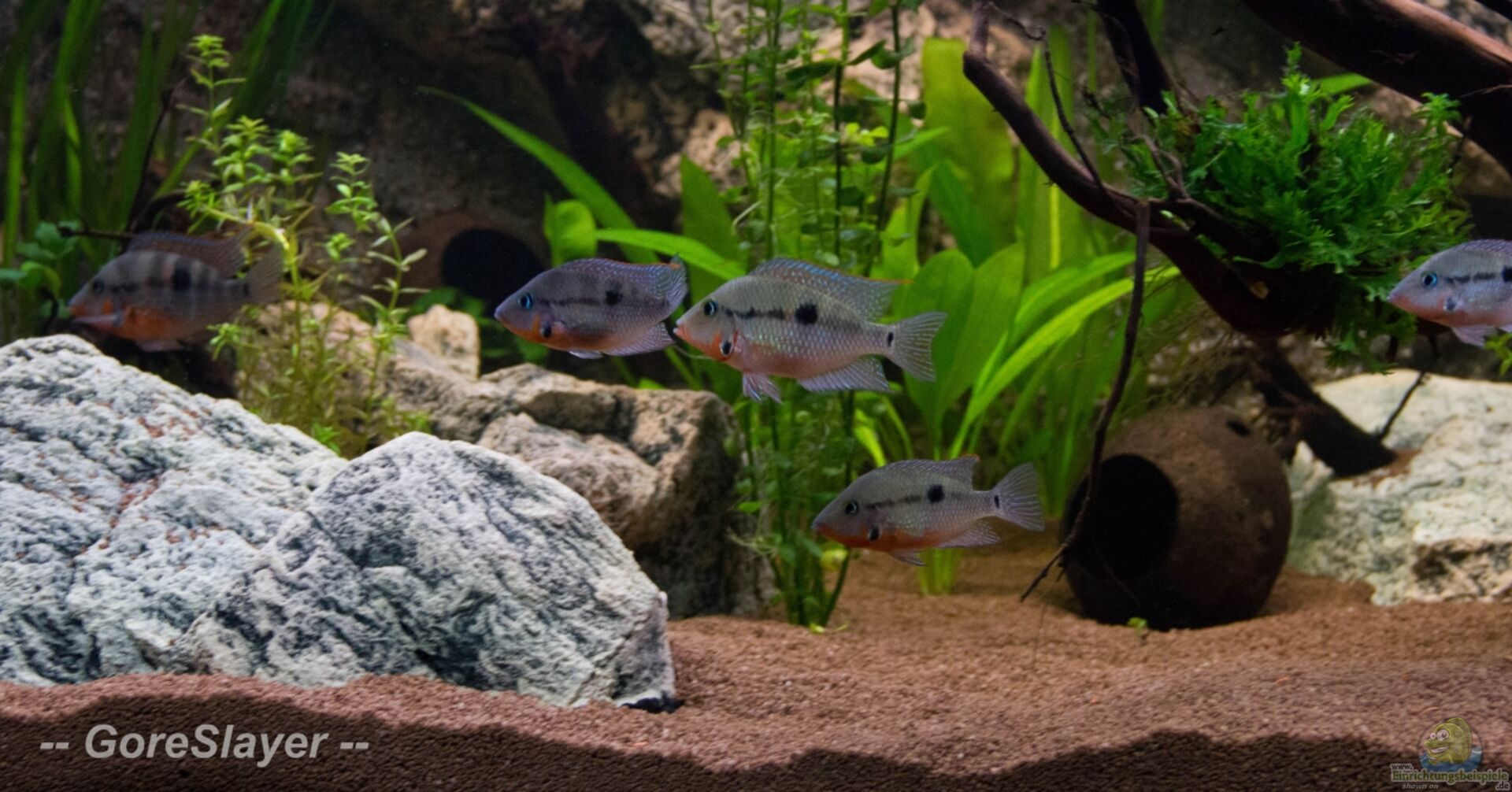 Aktueller Besatz: - 3x Chichlasoma meeki - Feuermaulbuntbarsch (2m, 1w) - 2x Ancistrus spec - Antennenwels (2m) - 6x Archocentrus nigrofasciatus (4m, 2w) - Grünflossenbuntbarsch -> davon jeweils 50% Farbvariante Weiss - 3x Andinoacara rivulatus - Goldsaumbuntbarsch (1m, 2w) Die Ancistrus wurden als ???Altlasten??? wieder mit eingesetzt, da sie bisher immer gut mit den Meekis harmonierten und ich mich ungern von Ihnen trennen wollte.