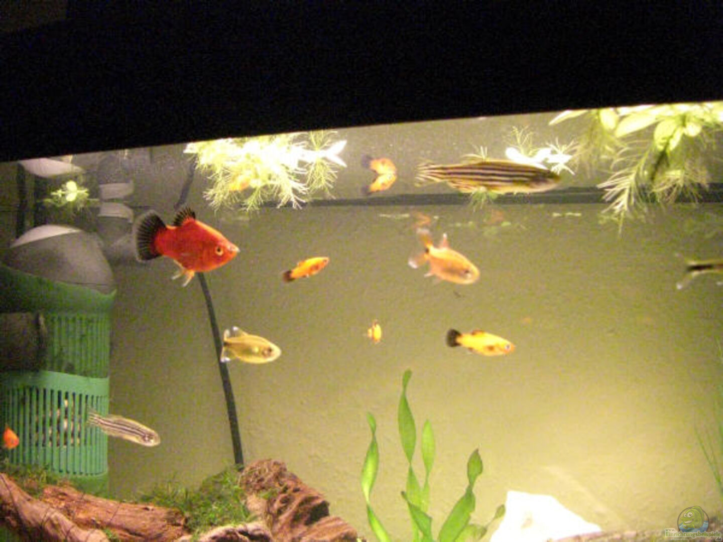3x Marmorierter Panzerwels (Corydoras paleatus) laut Mergus 9x Plati (Xiphophorus maculatus) (Paarung von Korallenplaty & Wagtail-Plati) 3x Zebrabärblinge (Brachydanino rerio) 3x Kupfersalmler (Hasemania nana) 3x Zwergschilderwels (Peckoltia vittata)