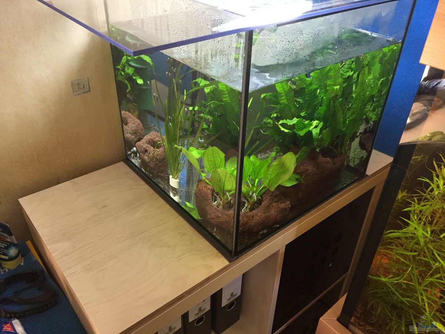 Es handelt sich um ein Standardaquarium ohne Besonderheiten. Die Abdeckung besteht aus einer Plexiglasplatte, die im Zweifel einen Fluchtversuch der Frösche aufhalten soll. Ursprünglich war dies mein Quarantänebecken und die ersten Bewohner, die in Quarantäne gekommen sind, sind sogleich drin geblieben :-D ... also ade Quarantänebecken