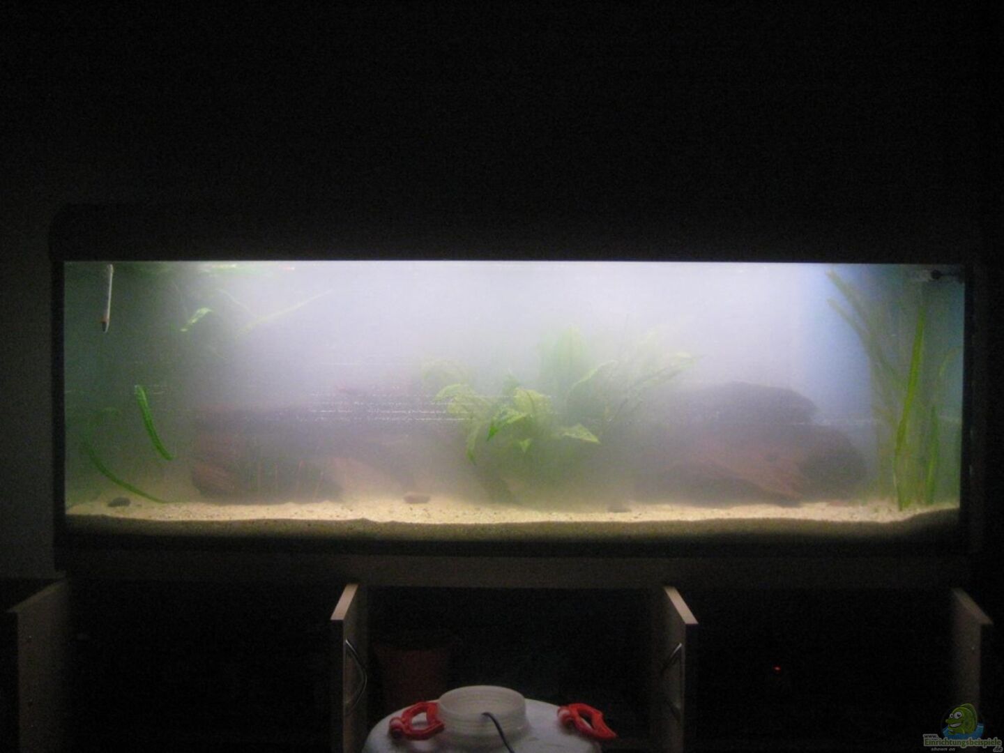 -Das Aquarium ist an der hinteren längs- , sowie an der rechten Seitenscheibe wärmegerdämmt um so den Stromverbrauch zur Beheizung des Beckens zu reduzieren. Dazu wurden jeweils, passend zur Scheibengrö??e, Styroporschaumplatten mit Silikon verklebt. -Der Filterung besteht aus einem selbstgebauten Hamburger Eck- Mattenfilter hinter dem die gesamte Technik verborgen ist. Dieser ist mit seinen beiden JBL Pumpen mit einer Gesamtumwälzleistung von 1140L/St. bei einem Stromverbrauch von nur 10 [...]