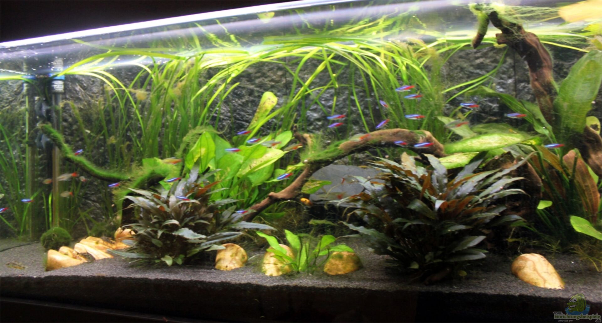 - 2x Walkers Wasserkelch - vorne - 1x Echinodorus x barthi (kleiner Ableger) - vorne - 1x Echinodorus x barthi - mittig - 1x Echinodorus schlueteri - mittig - 3x gro??blättrige Vallisneria - hinten - ca. 15x glattblättrige Vallisneria - hinten - 3x Mooskugeln - überall wohin sie die Strömung verschlägt - einige wenige Kleiner Froschbiss - Oberfläche (wird jede Woche reduziert) (Stand Nov. 2012)