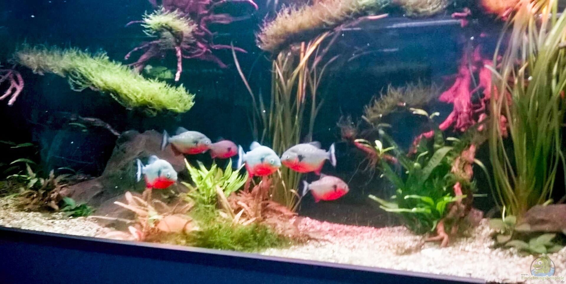 Pygocentrus Cariba (Schulterfleck-Piranha). Ich habe sie 2015 aus Venezuela erhalten und von 5 cm ab gro??gezogen. Der Gro??e misst mittlerweile 35 cm, die anderen 4 sind bei 30 cm. Beifische aus der Beckenauflösung des Sohnes: einige Guppies, siamesische Saugschmerlen und ein par Helena-Raubschnecken.