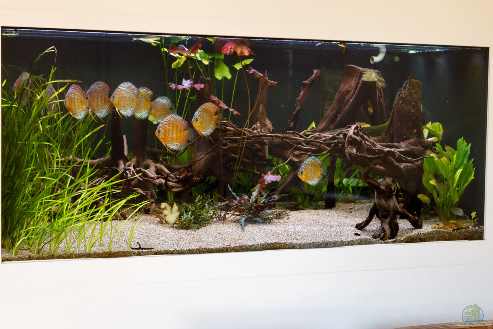 Aquarium mit 19mm Stärke bündig in Wand integriert und über Technikraum zugänglich (vor Ort verklebt) Die Seitenscheiben sind von au??en mit einer schwarzen Tönungsfolie beklebt. Die Rückscheibe ist von au??en mit einem 3mm schwarzen Acrylglas bedeckt. Videos unter https://www.youtube.com/@aquaristikflow4127