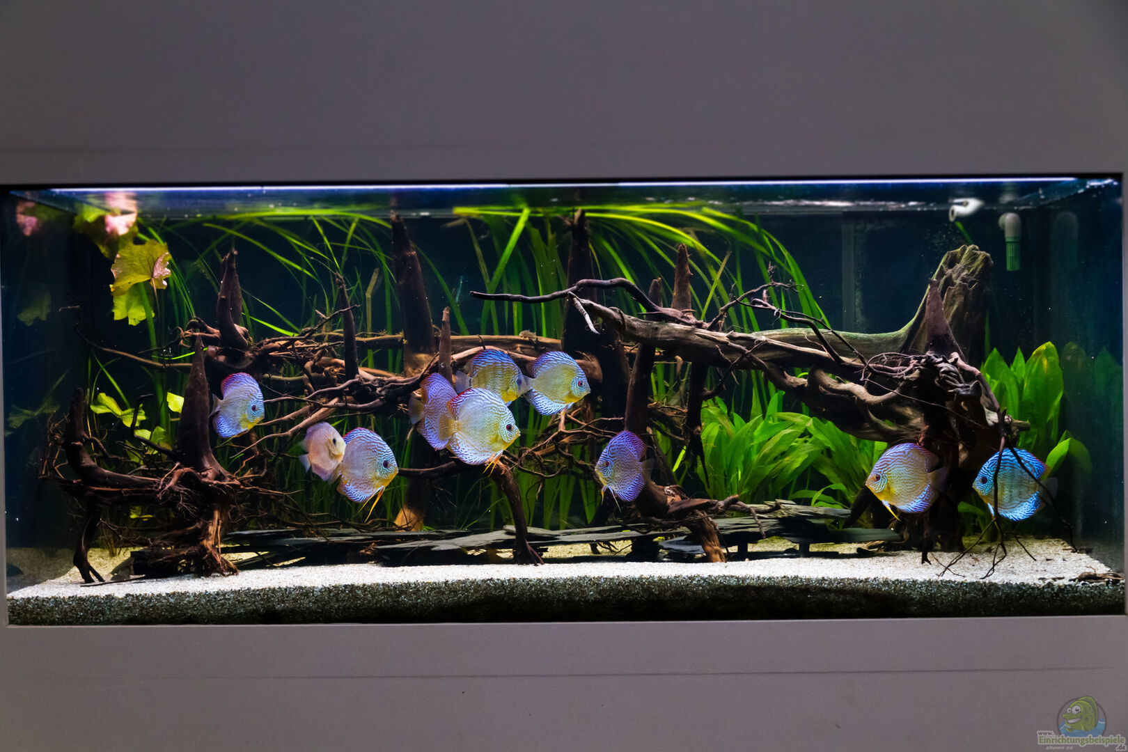 Aquarium mit 19mm Stärke bündig in Wand integriert und über Technikraum zugänglich (vor Ort verklebt) Die Seitenscheiben sind von au??en mit einer schwarzen Tönungsfolie beklebt. Die Rückscheibe ist von au??en mit einem 3mm schwarzen Acrylglas bedeckt. Videos unter https://www.youtube.com/@aquaristikflow4127
