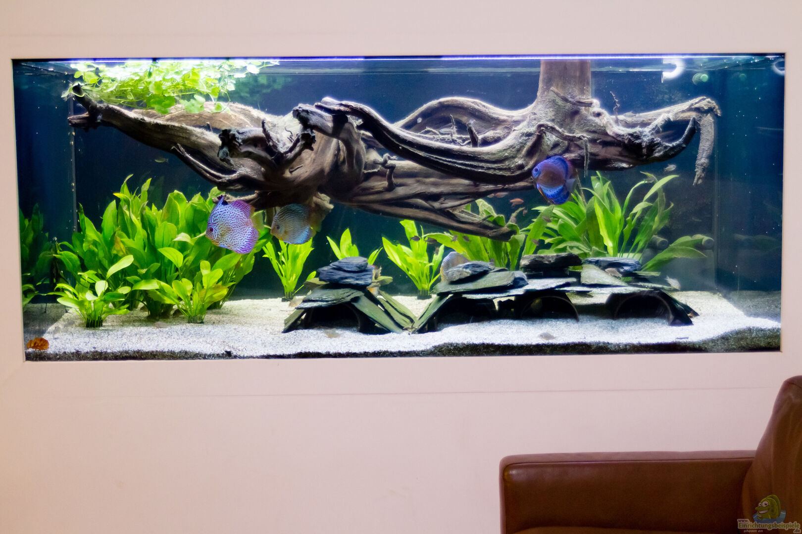 Aquarium mit 19mm Stärke bündig in Wand integriert und über Technikraum zugänglich (vor Ort verklebt) Die Seitenscheiben sind von au??en mit einer schwarzen Tönungsfolie beklebt. Die Rückscheibe ist von au??en mit einem 3mm schwarzen Acrylglas bedeckt. Videos unter https://www.youtube.com/@aquaristikflow4127
