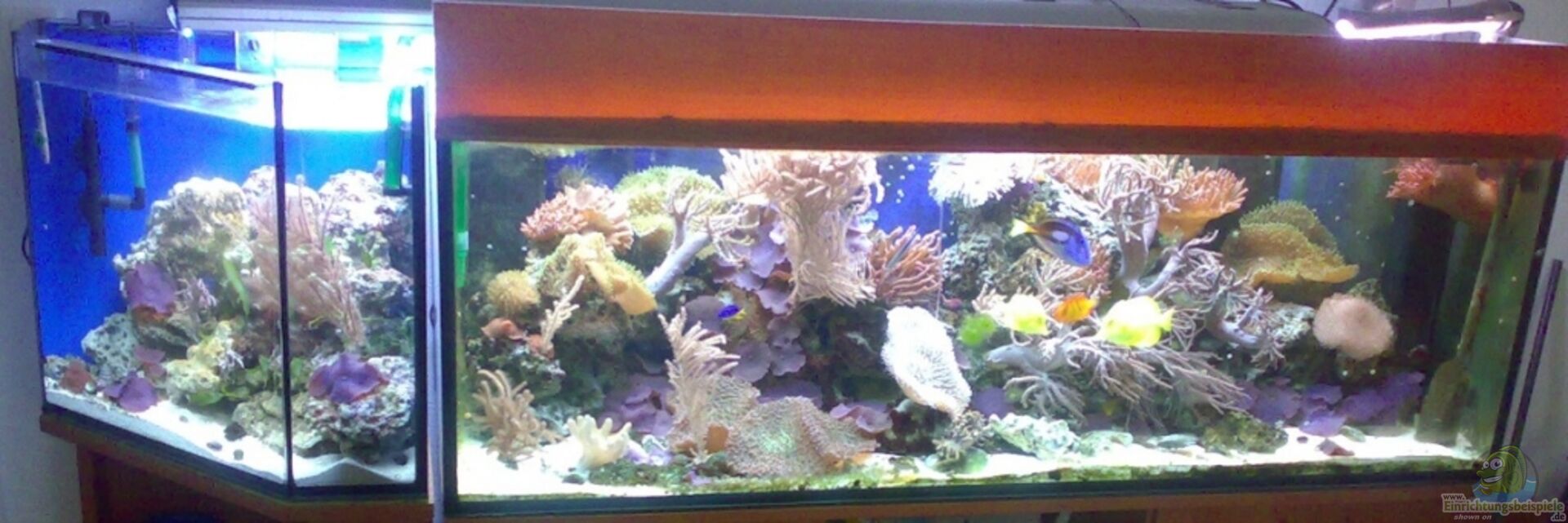 Das Becken wurde am 25.10.2010 neu eingerichtet und der Bestatz an Fischen Steinen und Korallen aus meinen vorherigen 2 Becken übernommen Zum Becken gehört noch ein 160 l Filterbecken mit 3 Kammern. In einer Kammer ist Lebendgestein und Caulerpa, in der 2. Kammer ist die Filtertechnik und die 3.Kammer dient zur Niveauregulierung