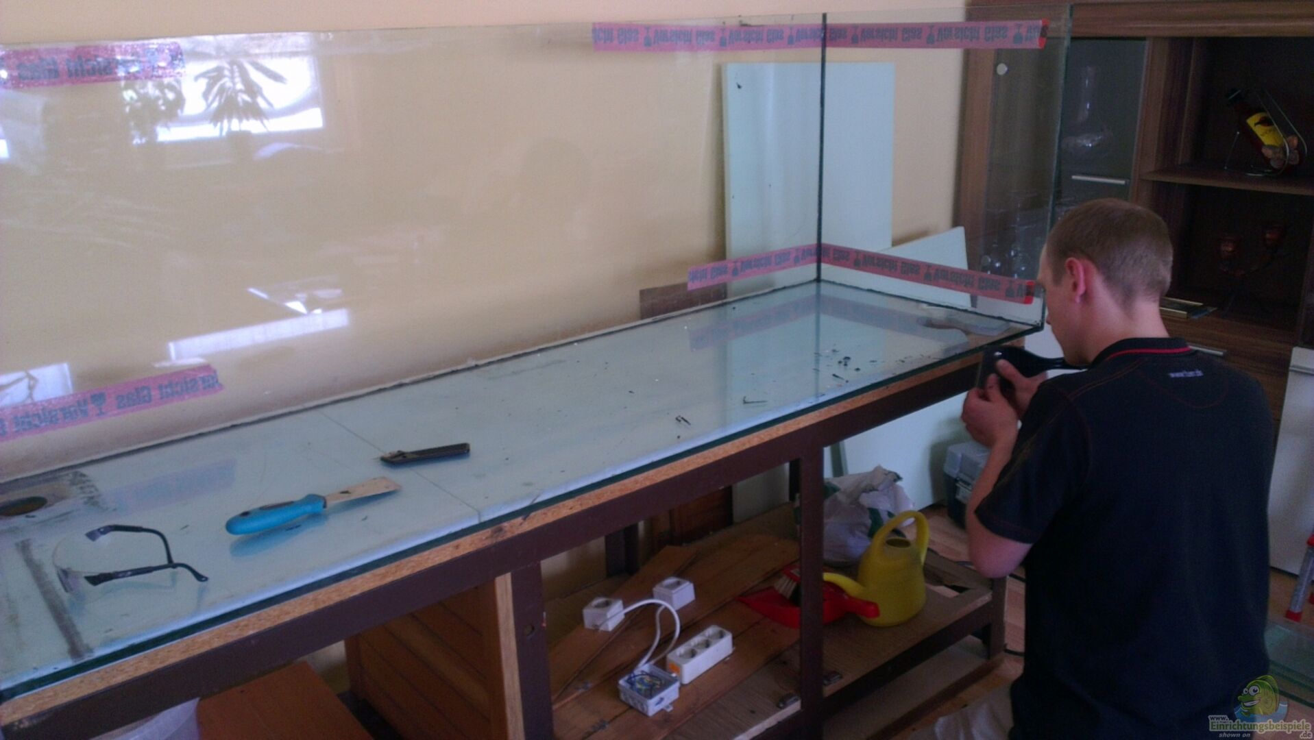 Das Aquarium ist ein Garagenfund. Das Becken steht auf einem geschwei??ten Stahlrahmen. Da die Scheiben aber so sehr verkratzt waren, habe ich mich dazu entschieden die Frontscheibe gegen eine neue zu tauschen. Im Zuge dessen, wurden auch alle Innennähte erneuert. Nach anfänglichen Bedenken, hält es aber bis jetzt dicht :-)