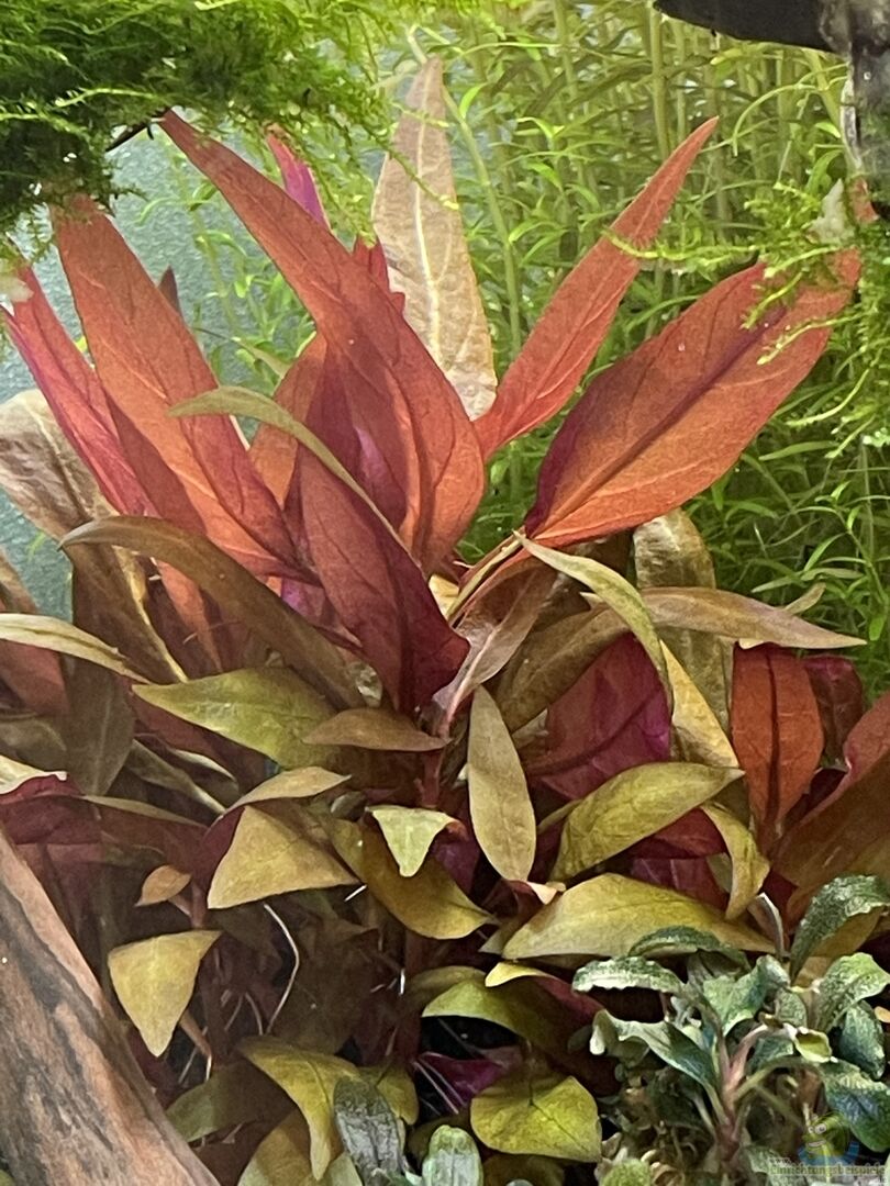 Hier gibt es Infos zu Alternanthera reineckii (Breitblättriges Papageienblatt) und Beispiele für die Einrichtung eines Aquariums mit dieser Pflanze.