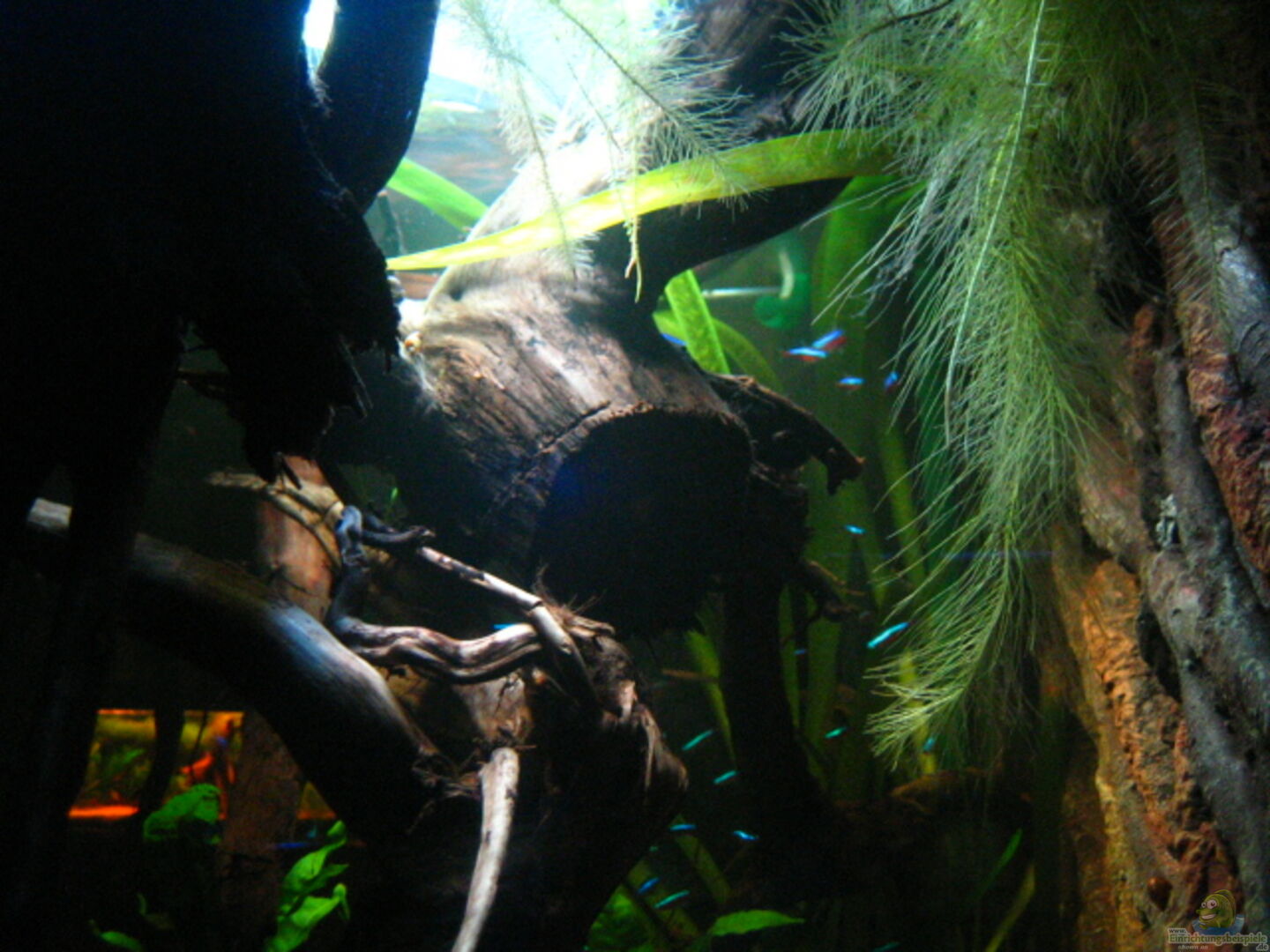 WURZEL WURZEL WURZEL Da mein Leitungswasser hier im PH Wert eher hoch (alkalisch) ist (knapp über PH 7) kommt mir die typische Gestalt des Rio Negros mit viel Wurzeln und Holz (im Uferbereich) sehr nahe. Durch die ausschliessliche Verwendung von Moorkienholz, drücke ich den Ph Wert durch die Abgabe von Huminsäure in einen recht annehmbaren Wert. Anfangs habe ich noch über Torf gefiltert, als sich das Becken jedoch eingespielt hat und ich das richtige Ma?? an Zugabe von Zapfen und Blättern [...]