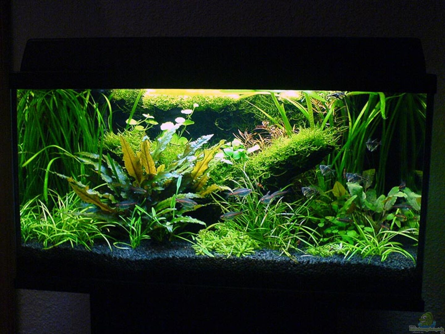 Das Aquarium läuft seit ca. 1995 und ist ein billiges NoName Produkt, von dem mittlerweile nur noch das Glasbecken selbst und die Abdeckung (ohne Leuchtbalken) original sind. Insgesamt wurde Wert darauf gelegt, dass die nötige Technik auch auf den zweiten Blick nicht zu erkennen ist ;)