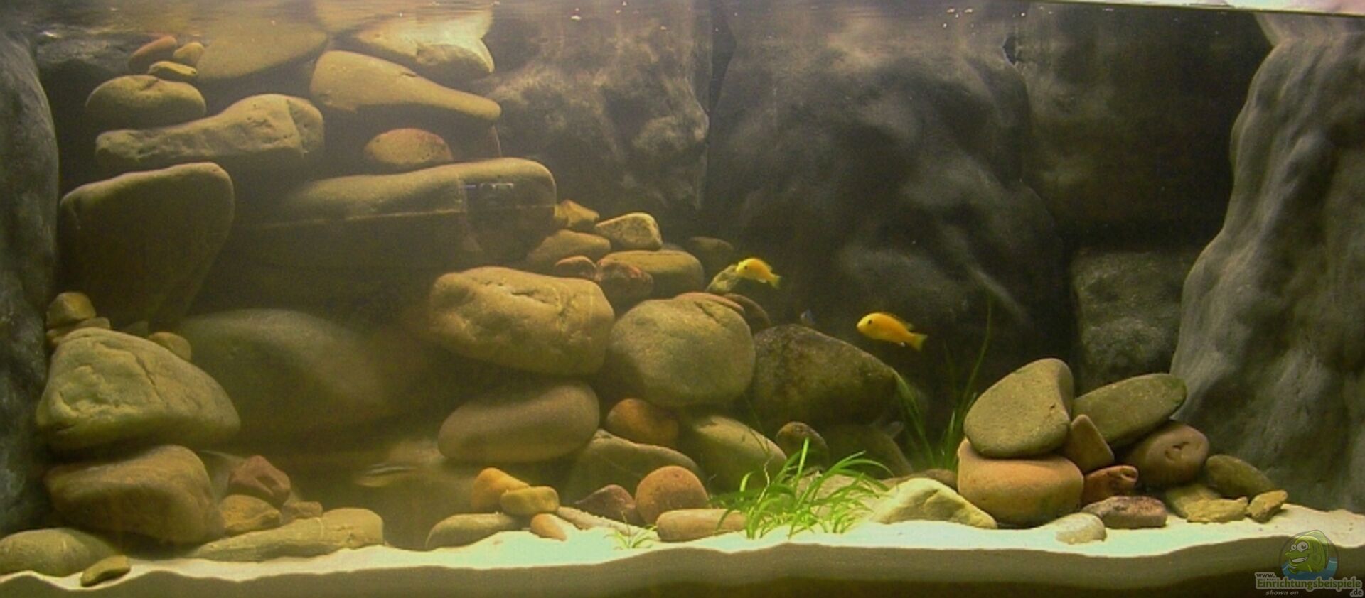 Die Rückwand ist eigentlich keine sondern aus Zement gebaute Felsen. Diese sind von innen hohl und bieten den Mbunas somit die Möglichkeit das ganze Becken zu durchschwimmen. Zudem sind hinter diesen noch Steine im unteren Bereich so das die gö??eren Höhlen noch mal unterteilt sind. Zusammen mit dem Steinaufbau vorne hab ich somit den Platz optimal genutzt um genug Versteckmöglichkeiten zu bieten. Die Zementfelsen wurden im übrigen gewässert und somit ständg das Wasser geprüft um festzustellen [...]