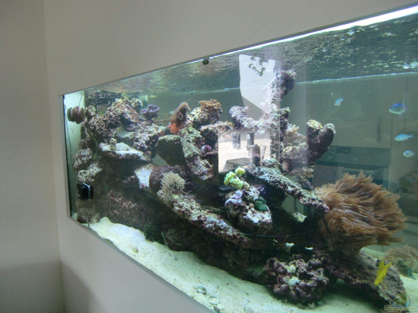 Filterbecken mit abfluss verbunden (wird umgebaut das der Abfluss zum teich geht) An der Aussenwand oben einen Abluftventilator angebracht und unten zuluftlöcher. In der Filterkammer ist Caulerpa taxifolia - Grünalge und wird wenn das Licht im Haupttank aus geht Beleuchtet (1x Aqua-Medic aquasunspot 12 W LED Spot) bis oben im Haupttank wieder das Licht angeht.