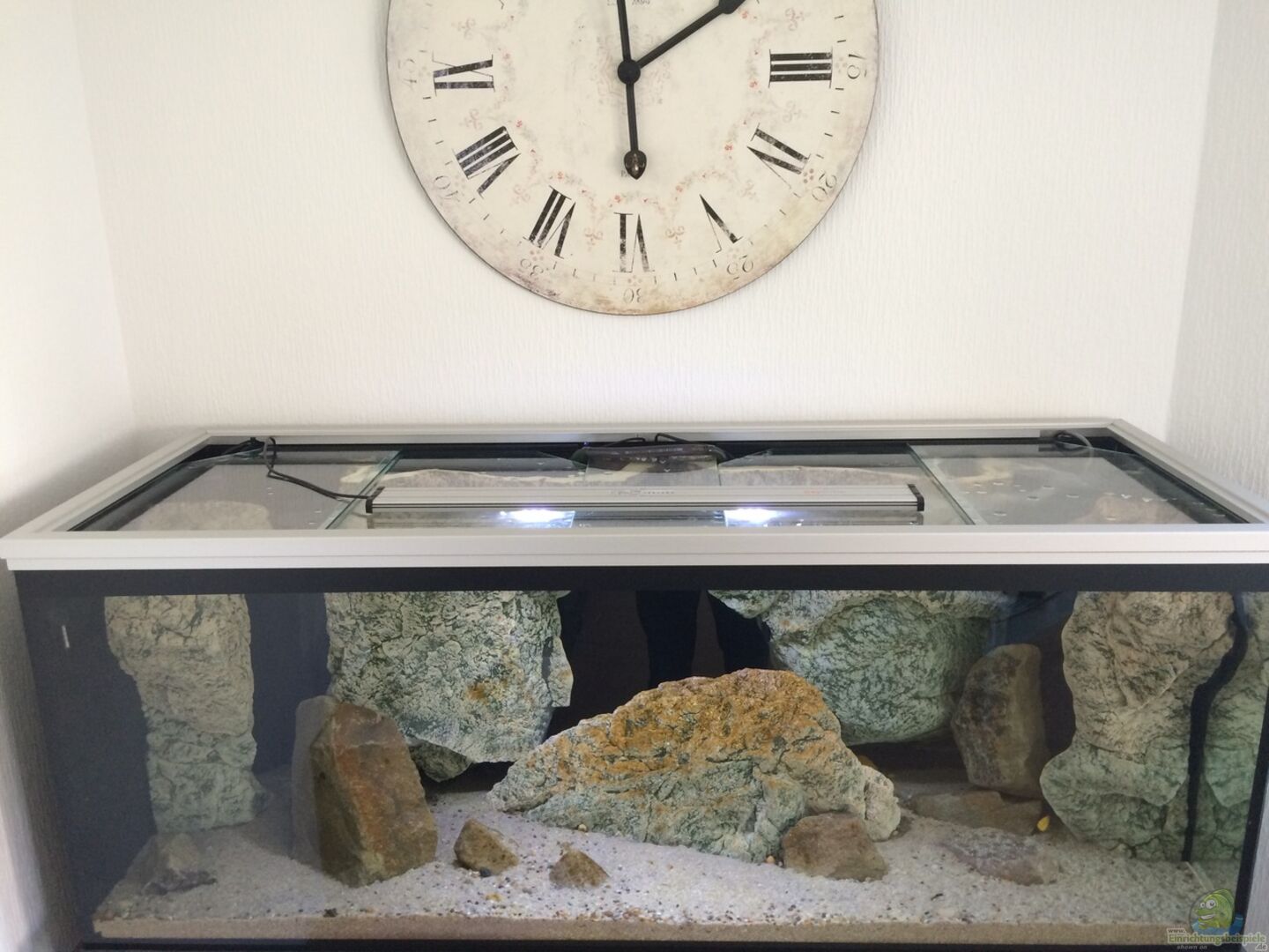 Becken aus 10mm Floatglas von JEKO-Aquaristik. Das Becken ist dreiseitig mit opaker Folie in schwarz matt beklebt. Rechte Seitenscheibe teilweise Kontur ausgeschnitten. Abgedeckt mit 4 Stück 4mm Scheiben. Jeweils rechts & links vom Mittelsteg 2 Stück die in schwarzen E-Profilen geführt werden. Diese liegen auf den längs verklebten Stegen. Somit kann ich die Abdeckscheiben relativ einfach bewegen - quasi Schiebetüren als Abdeckung. Unterbau besteht aus 45mm Alu-Profilen von Aluprofiltechnik [...]