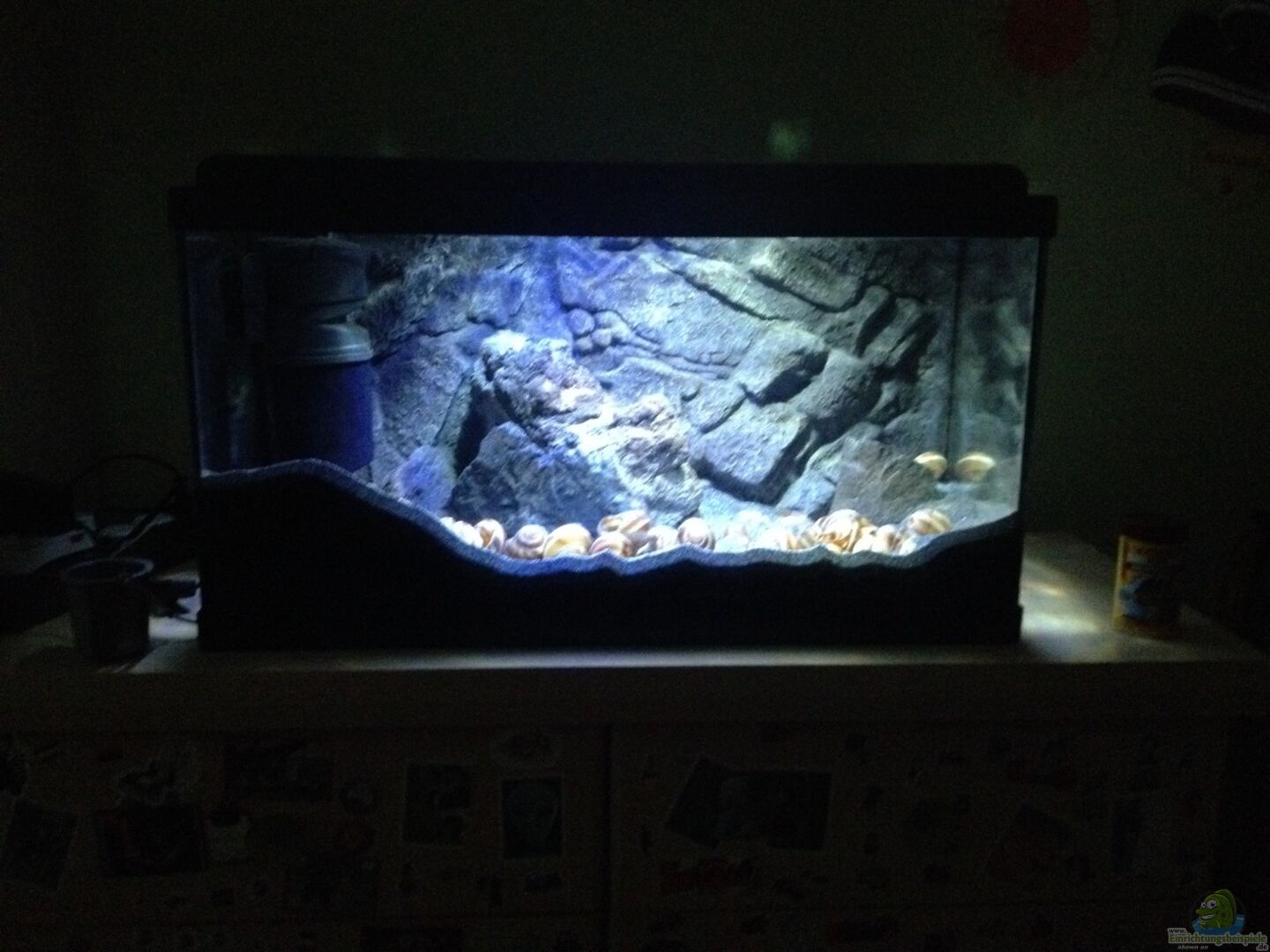 Ist das Aquarium meines Sohnes. Ursprünglich war es ganz Kleinkind- like mit Guppies besetzt. Leider hatte ich eine Schneckenplage (warum- keine Ahnung), der ich nicht mehr Herr wurde und so flog alles raus. Und ganz ehrlich- ich kann keine Pflanzen mehr anschauen - also, was macht man daraus- ein Becken für Mini- Landschaftsarchitekten!!